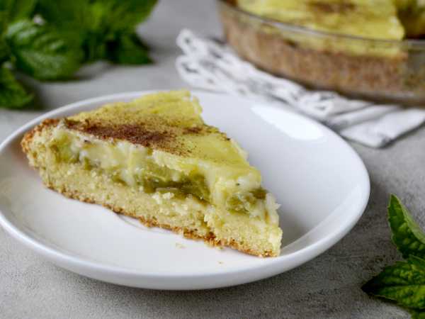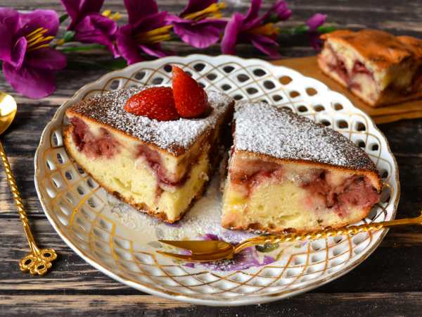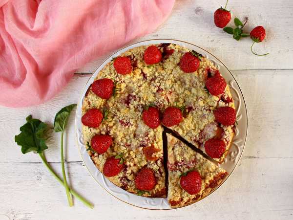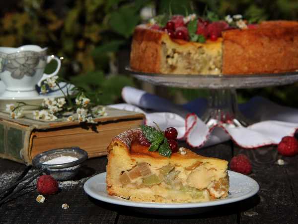 Тарт с ревенем и клубникой можно оформить свежими ягодами и листочками мяты.