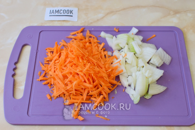 Очистите морковь с луком. Потрите морковь на терке, а лук мелко нарежьте.