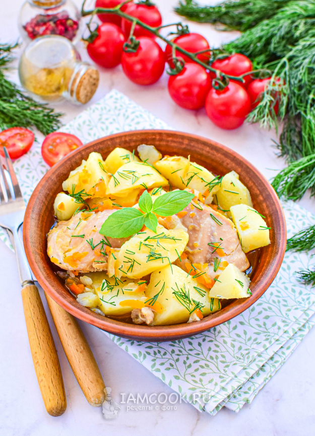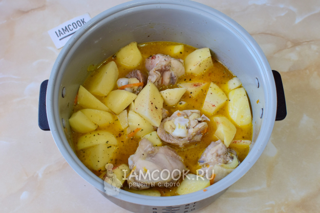 Картофель нарежьте крупными кусочками. Выложите его к курице. Добавьте соль и специи. Залейте горячей водой и доведите до кипения. Закройте крышку мультиварки и переключите её на режим "Тушение" на 30 минут.