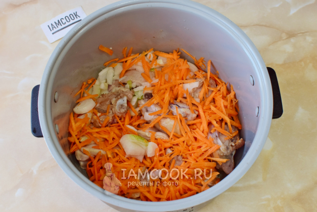 Следом отправьте в мультиварку морковь и лук. Перемешайте. Обжарьте все вместе еще 2-3 минуты.