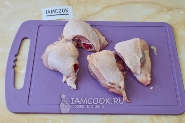 Разрежьте каждое куриное бедро на 2-3 части.