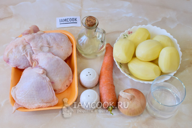 Соберите всё необходимое для приготовления куриных бёдрышек в мультиварке с картошкой. Если бедра заморожены, то заранее достаньте их из холодильника, чтобы они успели оттаять. Картофель очистите и тщательно промойте.