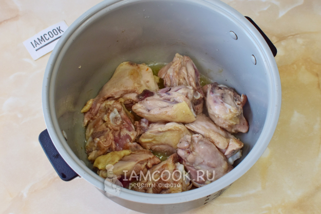 Включите мультиварку на режим "Жарка" и подождите, пока чаша нагреется. Затем налейте в неё немного растительного масла. Выложите нарезанные куриные бедра и обжарьте их со всех сторон, чтобы они изменили цвет и появился аппетитный аромат.