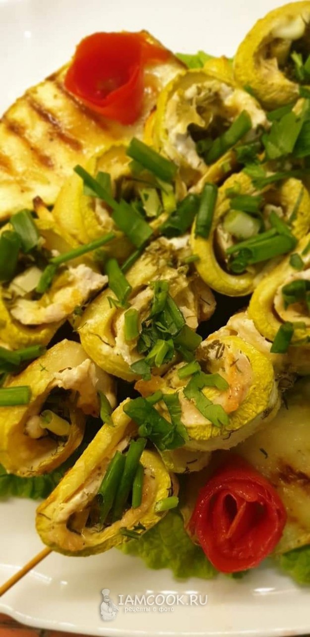 Завернуть в рулетик и надеть на шпажки (их предварительно замочить на час в холодной воде).