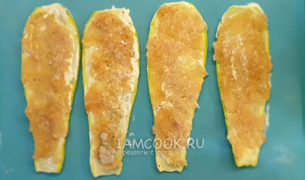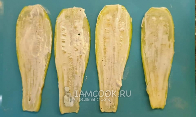 Кабачки нарезать вдоль тонкими дольками, примерно по 0,5 см толщиной. Смазать растительным маслом, посолить, поперчить. Выложить на противень, застеленный пергаментом, и отправить в разогретую до 180 градусов духовку минут на 8-10, чтоб стали мягкими.