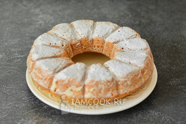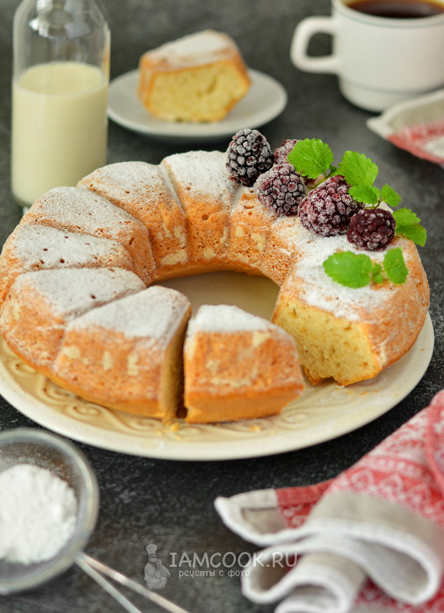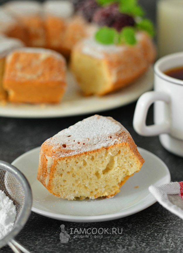 Готовый кекс переверните на тарелку, чуть остудите и присыпьте сахарной пудрой.