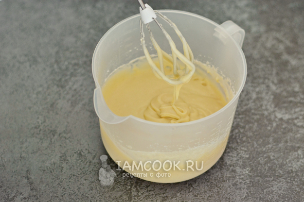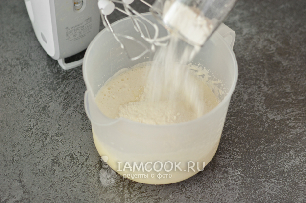 Введите в два приёма муку, смешанную разрыхлителем, и на низкой скорости миксера замесите тесто.