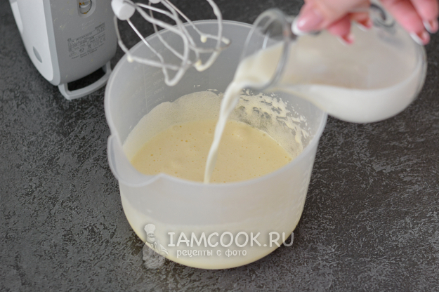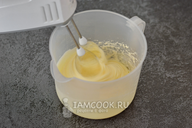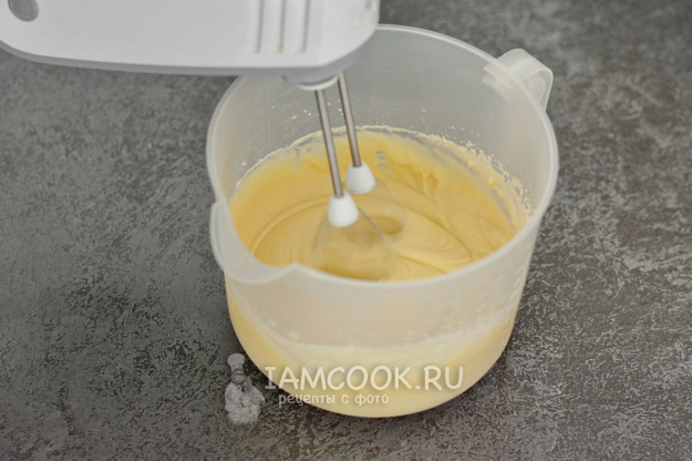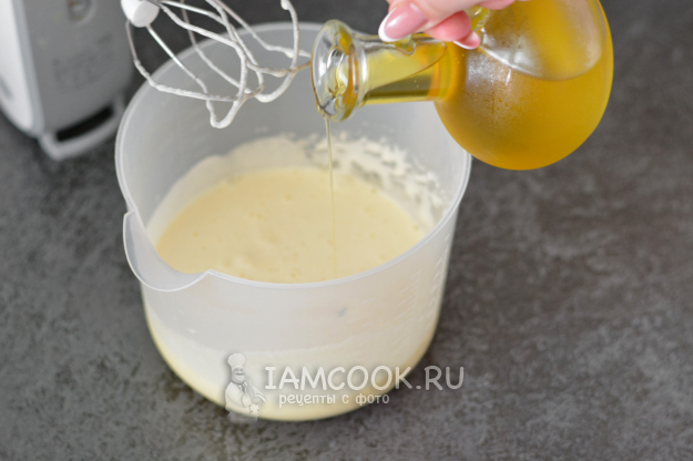 Следом влейте растительное масло и еще раз взбейте всё миксером.