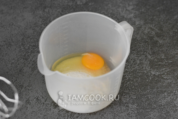 В рабочую ёмкость вбейте яйцо и добавьте сахар и щепотку соли, сразу добавьте ванильный ароматизатор.