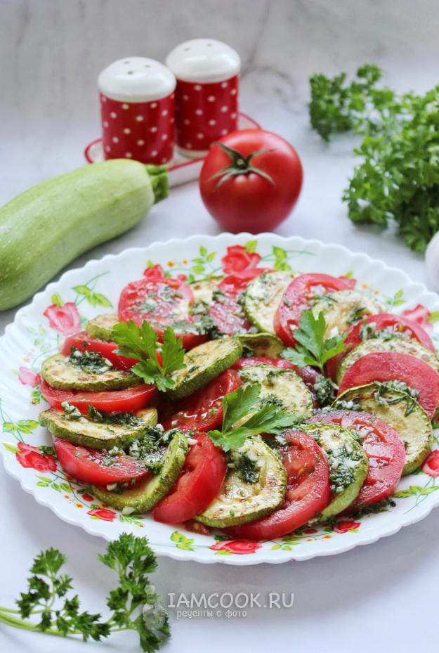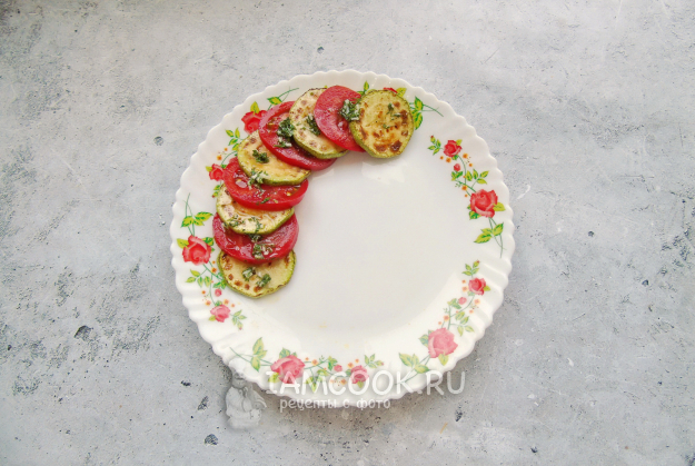 На тарелку выложите, чередуя, жареные кабачки с помидорами. Смажьте приготовленной заправкой.