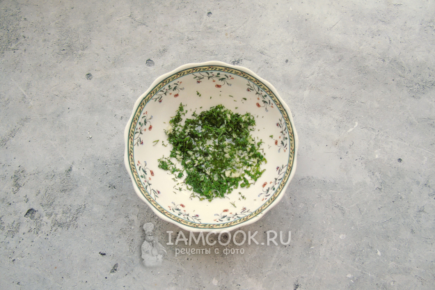 Приготовьте заправку для закуски. В мисочку выложите нарезанную зелень и чеснок, а также уксус, соль и перец. Перемешайте эти ингредиенты.