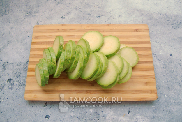 Кабачки помойте и нарежьте кружками толщиной 5-7 мм. Молодые кабачки можно не чистить.