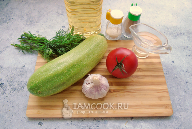 Соберите ингредиенты для приготовления закуски из кабачков с помидорами и чесноком.