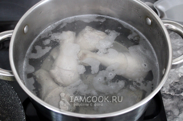 Поставьте вариться бульон. Для этого забросьте в закипающую воду куриные голени. Дождитесь закипания, удалите накипь. Добавьте душистый перец.