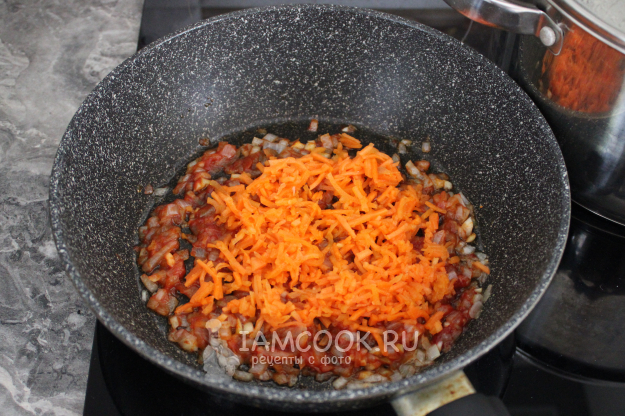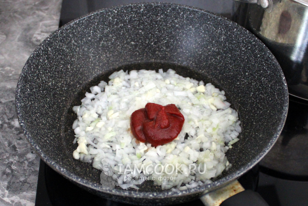 В процессе добавьте томатную пасту, давленый чеснок и нарезанную поменьше, т.е. покороче, морковь по-корейски.