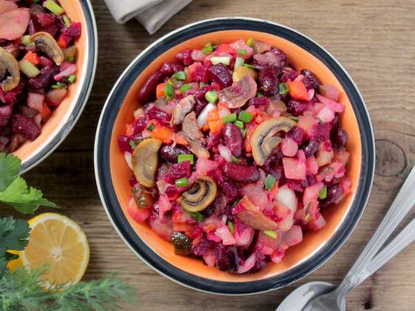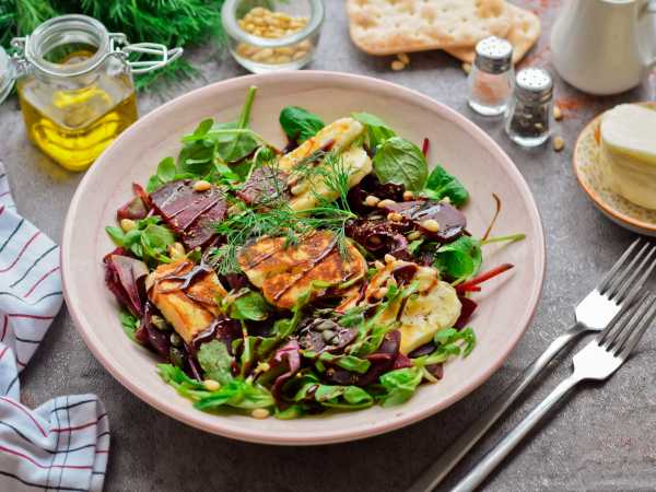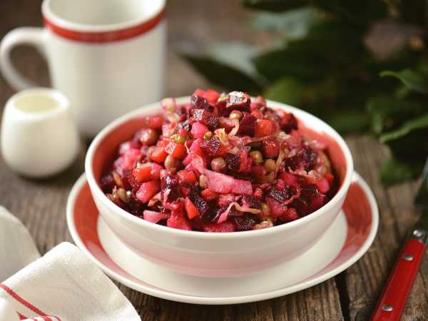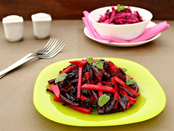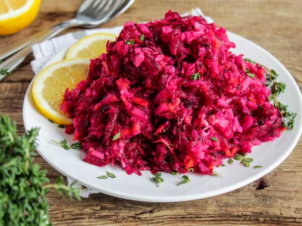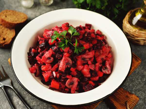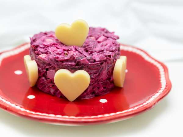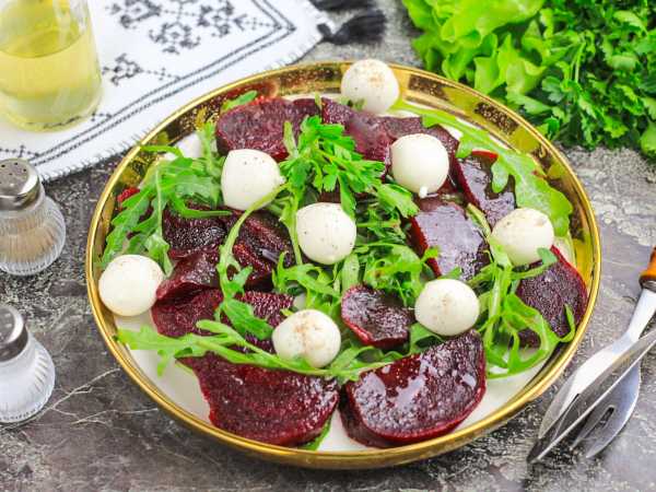 Выложим поверх страчателлу, воспользовавшись двумя вилками. Готовый салат со свеклой и страчателлой подаем к столу. Приятного аппетита!
