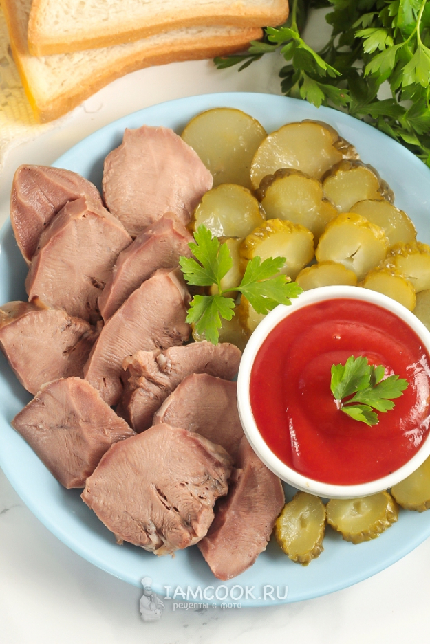 Нарежьте свиной язык ломтиками и подайте к столу с соусами, соленьями, салатом из свежих овощей.