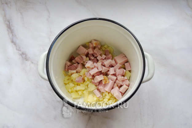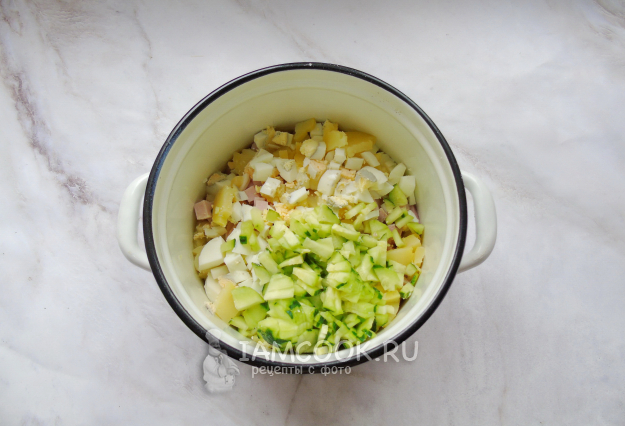 Отварите картошку в кожуре, охладите и очистите. Нарежьте мелкими кубиками ветчину, копченый окорок и картошку.