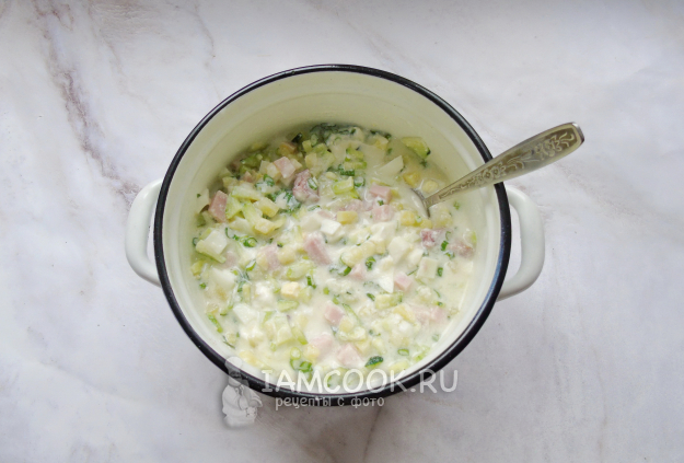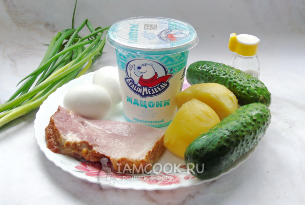 Соберите ингредиенты для приготовления окрошки на мацони.