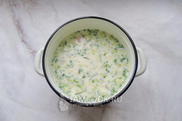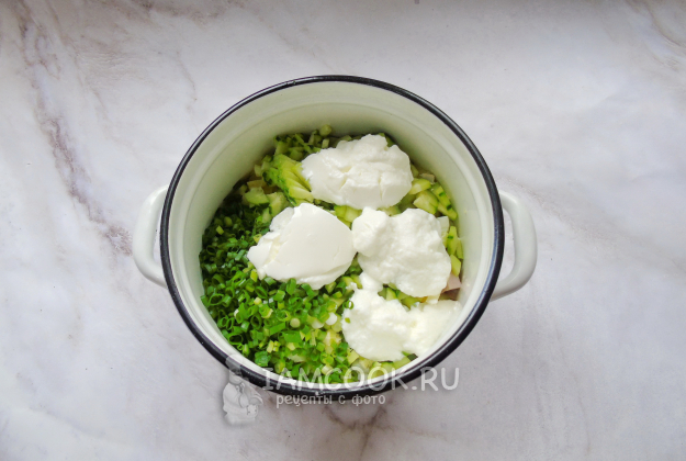Зеленый лук помойте и тоже мелко нарежьте. Добавьте в окрошку мацони.