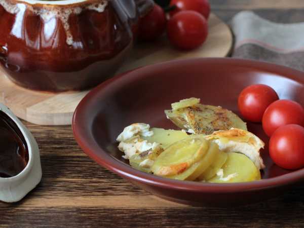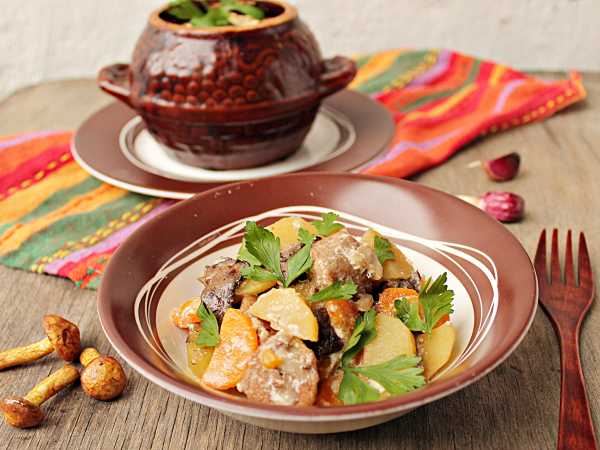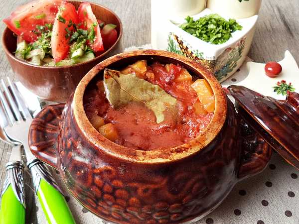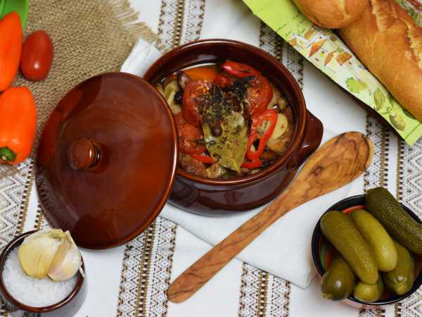 Зальем горячую, только что закипевшую, воду, добавим соль, паприку, перец. Заполненный горшочек накроем крышкой, поставим в духовку, включим разогрев до 180 градусов и от момента достижения температуры 180 градусов будем запекать 35-40 минут.