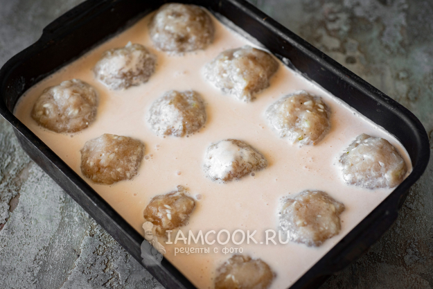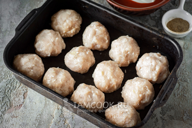 Приготовленным соусом зальем заготовки-ёжики в форме так, чтобы они были большей частью своей покрыты. Форму укроем фольгой (за 10 минут до готовности фольгу снимем). Отправим заполненную форму в уже разогретую до 180 градусов духовку на 40 минут.