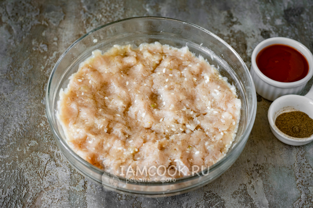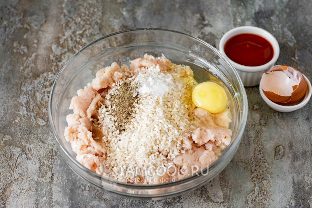 Эту однородную массу выложим в миску, добавим рис, яйцо, соль, перец.