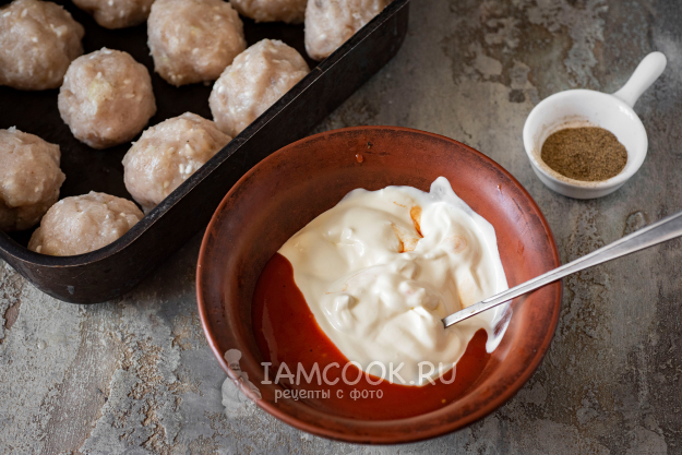 Готовим томатно-сметанный соус: в отдельной миске соединим томатный соус, сметану и воду. Все перемешаем.