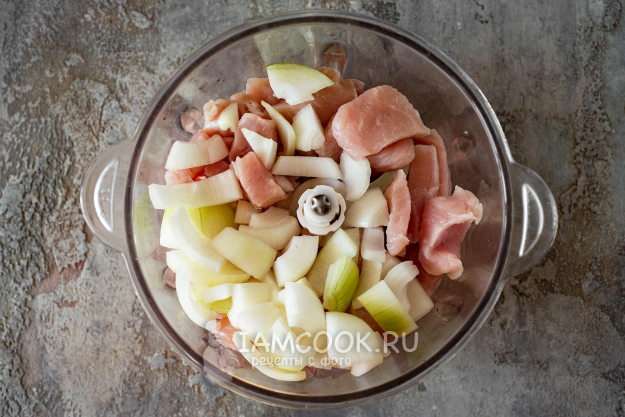 Приготовим фарш из индейки. В чашу измельчителя выложим филе индейки, нарезанное небольшими кусочками для удобства. Туда же выложим луковицу, также произвольно нарезанную. Запустим устройство до тех пор, пока не получится хорошо измельченная и однородная масса.