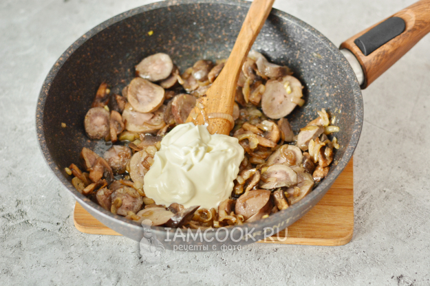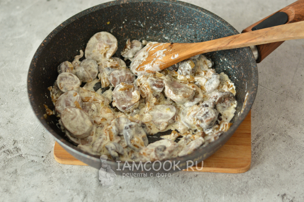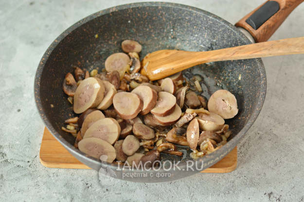 К обжаренным луку и грибам добавьте нарезанные ломтиками отваренные почки и обжарьте всё вместе ещё 5 минут.
