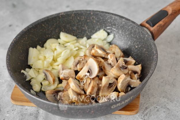 А тем временем нарежьте лук полукольцами, нарежьте грибы и сложите их в сковороду, добавив растительное масло.