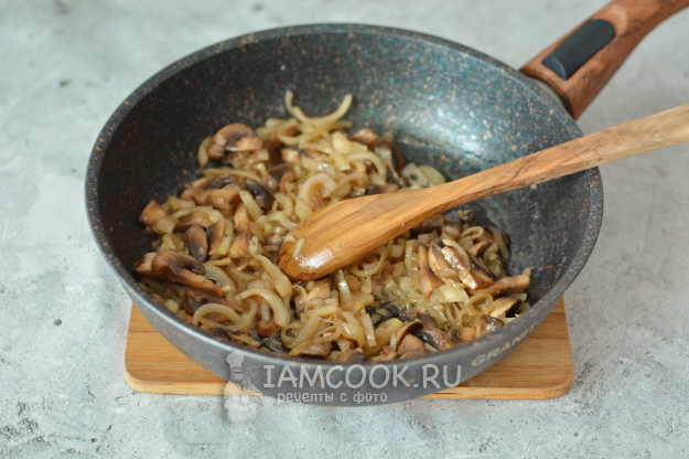 Обжаривайте грибы с луком до хорошего золотистого цвета, помешивая лопаткой.