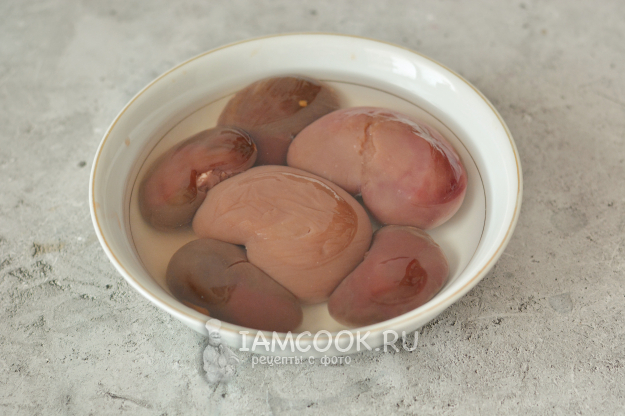 Замочите почки в чистой холодной воде на 2 часа, меняя воду 2-3 раза. Это избавит почки от характерного запаха. В воду можно добавить половину чайной ложки соды.