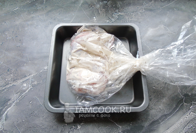 После этого выложите индейку в рукав или, как у меня, пакет для запекания. Налейте в пакет немного воды. В процессе запекания мясо пустит сок, но с самого начала этого не произойдет. И чтобы ваша индейка не пригорела, не пренебрегайте водой.