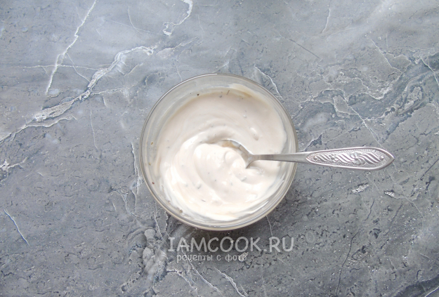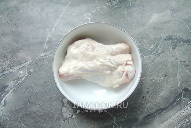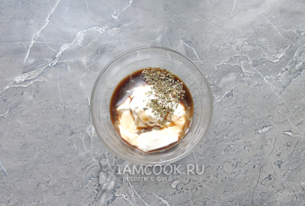 В принципе, достаточно мясо посолить, поперчить и выложить в рукав для запекания. Запечь его и уже будет вкусно. Но лучше предварительно замариновать индейку в каком-нибудь соусе. Это может быть любое понравившееся вам сочетание. Например, соевый соус, томатная паста или кетчуп, мед, чеснок, имбирь и т.д. Сегодня я выложила в мисочку сметану, налила соевый соус и добавила сушеный базилик.