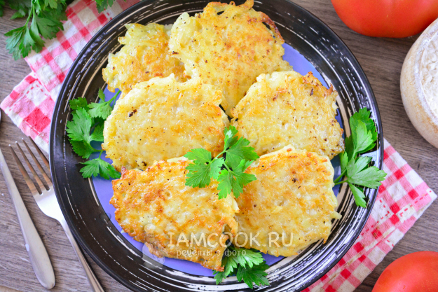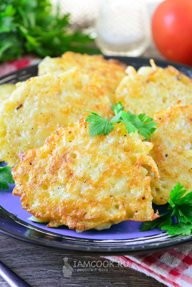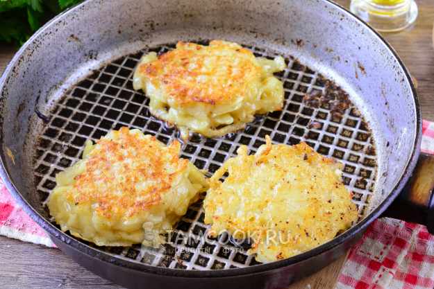 Жарьте драники из картофеля с помидорами и сыром с двух сторон по 4-5 минут. Сперва огонь сделайте средний, а когда перевернете, то слегка убавьте мощность, чтобы картофель хорошо прожарился внутри.