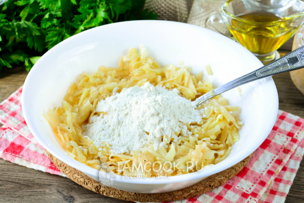 Всыпьте пшеничную муку и снова размешайте. Заготовка для драников готова.