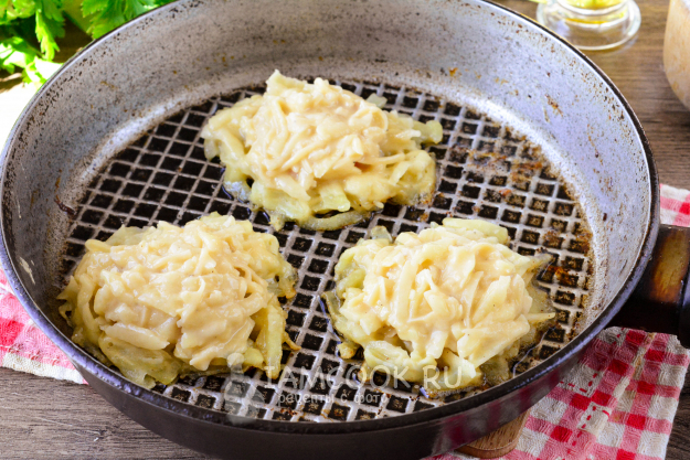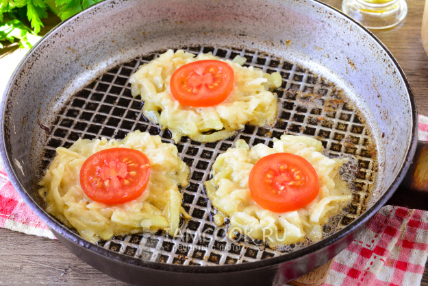 Закройте помидоры дополнительным слоем картофельного теста. Таким образом жарьте драники.