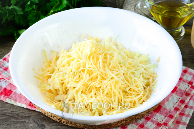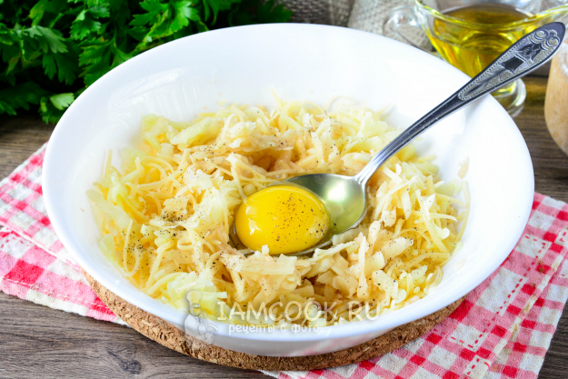 Почищенный картофель натрите на крупной терке, переложите в глубокую тарелку. Туда же натрите на терке любой твердый сыр.