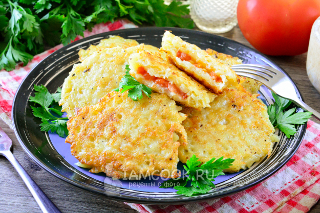 Картофельные драники с помидорами и сыром получаются невероятно вкусными, ароматными и сочными за счет начинки.