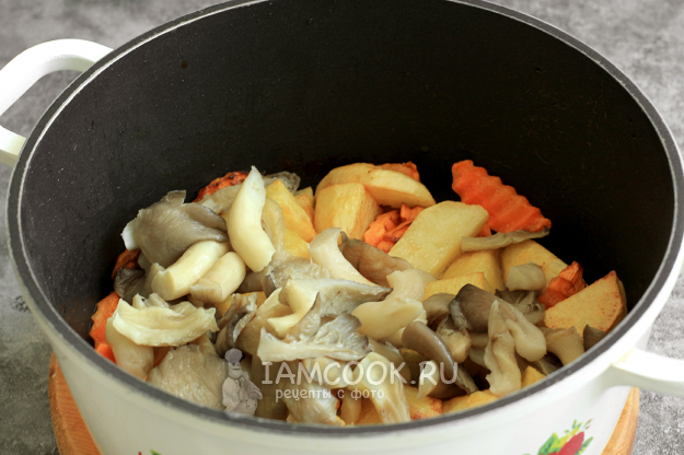 В казан с картофелем добавьте промытые и обсушенные грибы. Обжаривайте 3 минуты на среднем огне.
