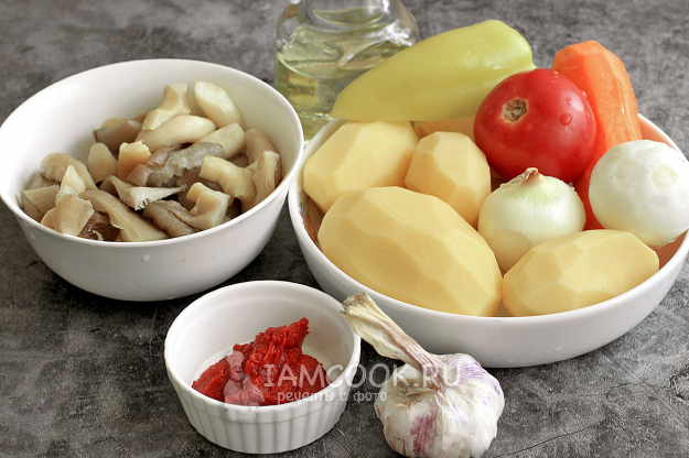 Для рагу с картофелем и грибами возьмите все нужные продукты.