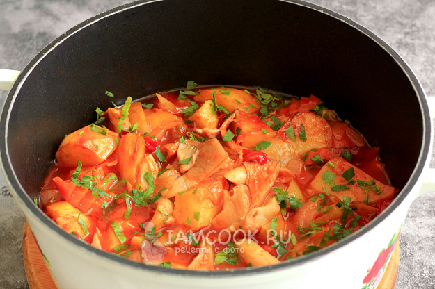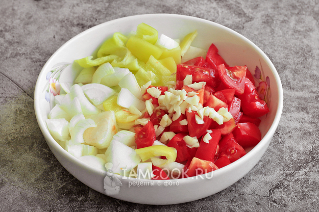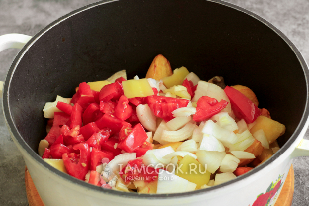 Затем отправьте в казан подготовленные помидоры, перец, лук и чеснок. Держите на огне еще 3 минуты. Хорошо посолите.
