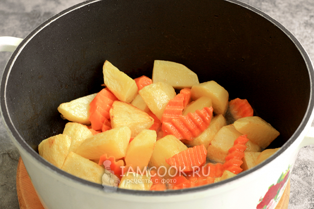 Сначала разогрейте казан или глубокую сковороду. Затем налейте масло и также нагрейте, и только потом опустите в масло очищенный и нарезанный картофель. Вся нарезка крупная. Обжарьте картофель 3 минуты на среднем огне. Во время обжаривания всех овощей держите средний огонь.