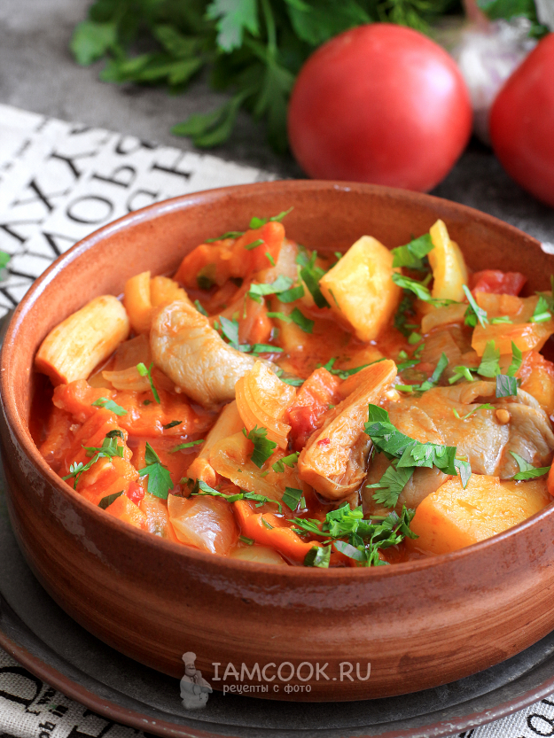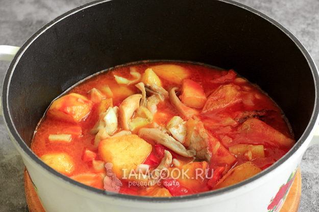 Томатную пасту разведите в стакане воды и добавьте в казан. Накройте казан крышкой, доведите жидкость до кипения и уменьшите огонь до малого. Больше ничего не перемешивайте, иначе получится каша. Тушите рагу из картошки с вешенками до готовности картофеля, в томатной среде он готовится дольше - примерно 20-30 минут.
