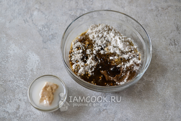 Перемешайте солод и муку с кипятком. Получится густая масса. Оставьте для остывания до комнатной температуры. Дрожжи также оставьте для распускания.