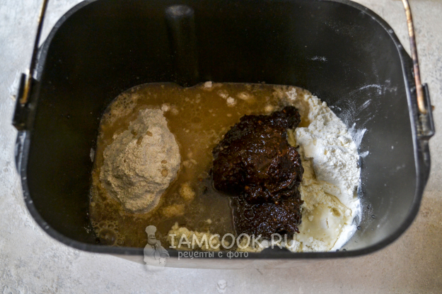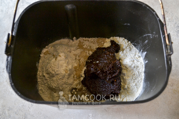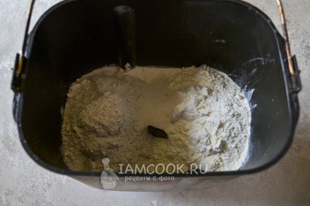 В ведерко хлебопечки просейте всю пшеничную муку и оставшуюся ржаную муку (250 г), соль и сахар.
