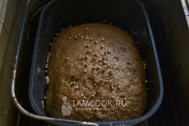 После основного замеса оставьте ведерко в хлебопечке для подъема теста. Когда тесто хорошо поднимется, посыпьте верх зернами кориандра. Включите хлебопечь на программу "Выпечка" на 1 час.