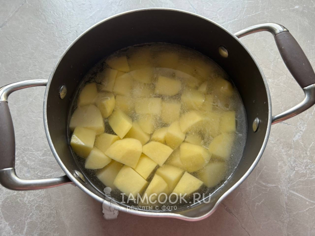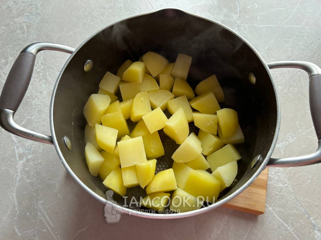 Картофель очищаем, нарезаем и ставим вариться в подсоленной воде на 20 минут.