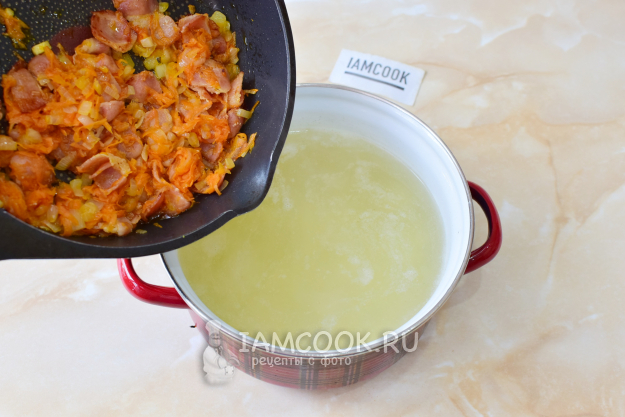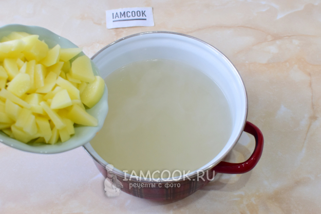 В кастрюле закипятите бульон. Выложите в него картофель, нарезанный небольшими кусочками. Оставьте вариться на 12-15 минут.